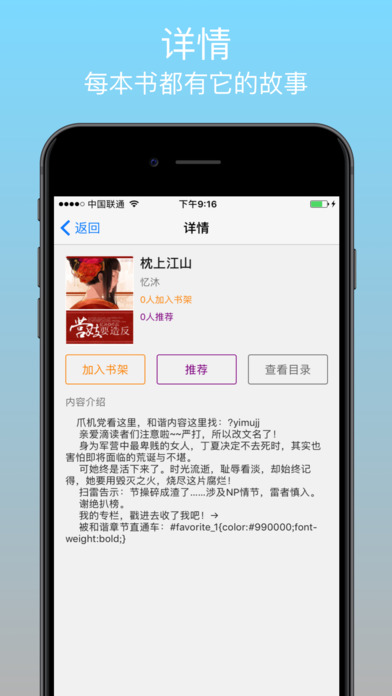 最热门的txt小说阅读器 【丰富资源】 数万本小说资源,各类热门小说榜单一网打尽:言情,耽美,武侠,玄幻,魔法,都市,历史,军事,恐怖,灵异,穿越,推理,修真,科幻等。。。 【txt免费下载】 数万本txt小说全部免费下载,不需要vip,不需要购买书币,完全免费下载阅读。 【优质阅读体验】 阅读界面精心设计和排版,白天夜间模式切换,字体大小随意调整,背景颜色随意切换,翻页模式喜欢就改。 【最贴心的客服交流】 本App由个人开发者日夜编码而来,犹如自己的孩子般,本人对待各位用户的各种建议会尽心倾听,及时作出反馈,欢迎广大用户给评论,多交流。 QQ群:157746098 微信:wengxianxun 公众号:一季烟雨 或 misty363