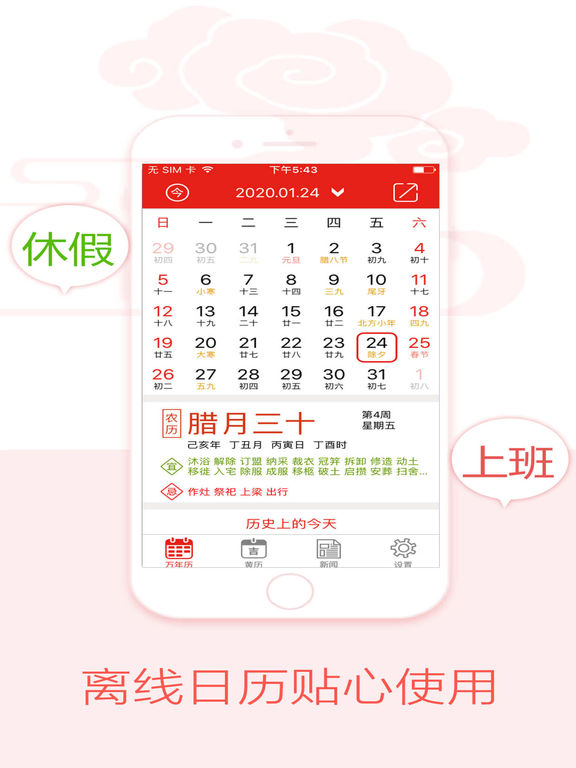 全新万年历日历,拥有最贴心的日历界面,200年精准黄历数据,并且支持离线使用。 ***玄学、运势专家解说*** ***现代文说明详细解说*** ***各种节气、节日完全记录实时提醒*** ***涵盖历史上今天发生过的重大事件*** ***生活小工具应有尽有***