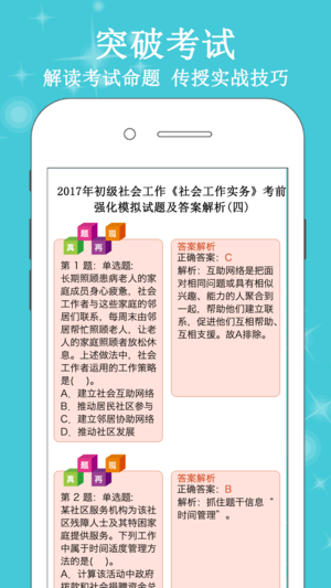 本软件为社区社区工作者公开招聘考试的软件,精心准备了2017年试题,量身为社区考试量身打造,对社区考试真题预测的准确度,最大限度的把握社区考试命题趋势。为考试的提供了充分的复习准备,可随时随地学习练习,有效帮助顺利通过考试,学习知识通过考试必备神器! 【功能介绍】 1、专项训练:综合基础知识单选题、多选题、判断题、公文题、案例分析题专项训练,每一道题目都有详尽的解析,可选择不同题型,并可手动将易错或未牢固掌握的题加入复习库和错题库,以便反复练习。 2、冲刺押题:最新考试押题8套,是目前最切合社区考试的试卷。每一道题目都有详尽的解析,可选择不同题型,并可手动将易错或未牢固掌握的题加入复习库…