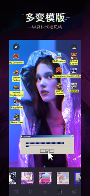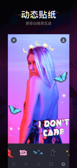 VaporCam,超现实图片编辑器,打造酷炫的蒸汽浪潮。 全系列复古、蒸汽元素的滤镜贴纸,浓厚的黑暗潮流气息。 VaporCam,坐上挂满霓虹灯的时光机,带你穿梭到八、九十年代 在蒸汽弥漫的梦中停滞、沉浸 用已脱离肉体的真实感官,在怀旧中感受现代 在欲望、情感与自由之中,感受蒸気波的意乱情迷 • Vapor,滤镜 / フィルター 特别的 Lo-Fi 低保真效果 仿佛瞬间穿越回80年代,看着粗糙且跳帧的录像带 迷醉与暗黑的幻觉,让人目眩的同时,也让人无限上瘾 • Vapor,贴纸 / スタンプ 数百张蒸汽波不同风格的贴纸资源 日系、电子、复古、雕塑、海豚、拼贴、80年代的街机与像素风……