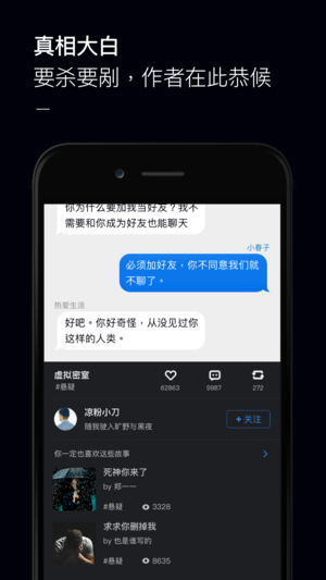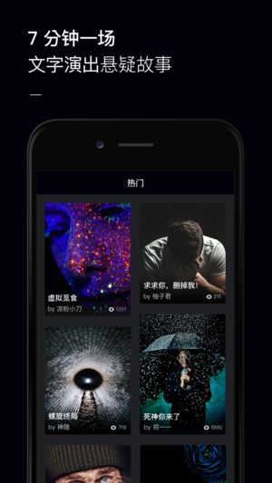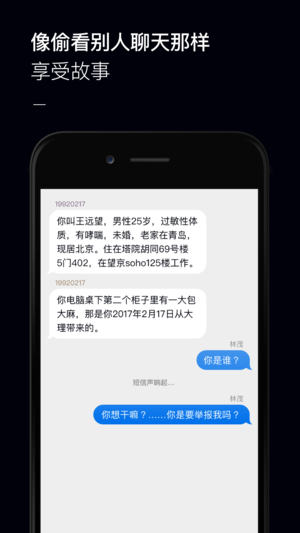 集结悬疑故事,七分钟看一场文字电影。 全新对话场景,花开团队黑化犀牛故事。 【下载必看】 《螺旋终局》:90%的人看完这个故事都会立刻从头重新看。叫人颔首叫绝的迷幻故事结构,读懂的人都大喊『过瘾』! 《彩虹桥杀人事件》:姐姐因为绑架案身陷精神病院?弟弟因为手机几乎命丧黄泉?调查步步深入,十年前的爱恨纠葛渐渐浮出水面…… 《杨老师!这里有两个女孩不乖!》:要不要跟女孩们一起,做电击爱好者杨老师的精品小孩? 【App特色】 1.轻触屏幕唤醒故事,还原对话场景,就像偷看别人的聊天记录那样享受故事。 2.精耕“对话体故事”原创创作,不是推理小说,却更扣人心弦! 3.新产品特别福利:限定故事分享后返回A…