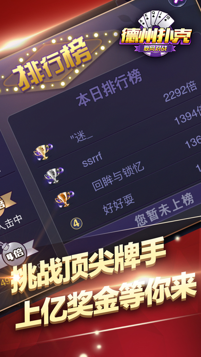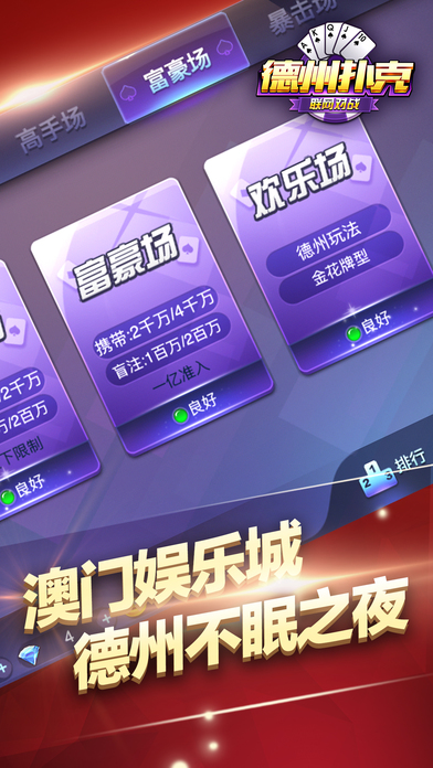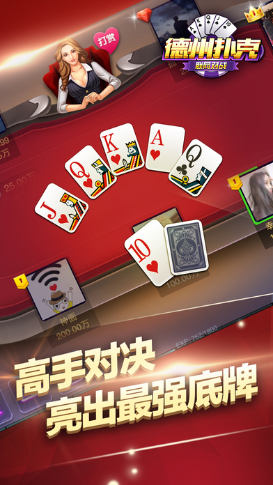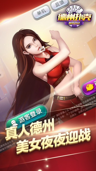 全球最火爆的德州扑克让你领略“手机棋牌”的无限乐趣!精致的游戏画面,极致的操作体验,更多美女邀你来战,不管你是德州高手还是新手上路,都可以在皇家德州扑克(午夜版)中体验到前所未有的刺激! *创新百人场,下注、坐庄,就一个字:爽!让你体验壕的享受! *登陆送、玩牌送、任务送、活动送、破产送,天天各种送,天生土豪,就是任性! 精心打造的一款精品扑克游戏,玩法来源于风靡全球的德州扑克,在沿袭经典玩法的基础上融入了中国元素,并提供奥马哈、大菠萝等多种玩法,为玩家带来刺激又丰富的扑克竞技体验。随时随地与微信、手Q好友一起玩,排行榜争夺战、互赠礼物,秀牌技、秀排名,2017年的潮流就是和好友一起玩天天德州。来吧,加入天天德州,亮出你的底牌! 德州扑克——既能娱乐又能轻松赢的游戏,精致的游戏画面,极致的操作体验,更多美女邀你来战,不管你是德州高手还是新手上路,都可以在澳门德州之夜中体验到前所未有的刺激! *创新百人场,下注、坐庄,就一个字:爽!让你体验壕的享受! *登陆送、玩牌送、任务送、活动送、破产送,天天各种送,天生土豪,就是任性! 德州扑克大师俱乐部,粉丝必备! 天天大奖赛,万人在线PK,超多豪礼等你来拿! 游戏特色: 1,登录就送大量游戏金币,玩牌更能获得土豪大奖! 2. 玩法丰富多样,经典玩法、懒子玩法。还有更多其它小游戏刺激惊险,爽翻天! 3. 游戏画面精美简介,豪华的视觉体验,真实的拉斯维加斯感受! 4. 专业顶尖的防作弊系统,让你感受公平,公正,公开的高手对决! 5. 单手操作,让你无时无地都能畅玩PK,还有真人美女陪你来玩。 稳定性:采用国家一流服务器,保证让你快乐游戏,不卡,不断,不掉线 省流量:没wifi,不敢玩?不要怕,捕鱼德州扑克只要一点点流量就够了 多特效:哪怕只是私房,我们的特效,美术都绝不含糊 人性化:各种提示,让你不会错误操作 【精致优雅的界面】全新竖版操作界面,给你简单易上手的操作体验,单手执掌德州风云,让你的all in更有气势! 【美女主播互动上线】超大屏高清画质,超便捷聊天,随时随地与主播互动! 【停不下来的奖品】统统免费,筹码天天送,新款电脑、手机、手表等不限量兑换! 【一百人同桌竞技】百人德州场,上万真实玩家,更有赢不完的筹码! 【不能缺少的社交】多种好友排行榜,与好友比拼牌技和财富;丰富的礼物互动,玩牌交友两不误! 【更多惊奇玩法】水果机、猜拳、NBA竞猜、压牌⋯更多有趣刺激的活动等你来发现! 德州扑克源于德克萨斯州,是全世界最火爆、最好玩、最刺激的扑克游戏。夜夜德州是国内德扑圈APP中的佼佼者,它规则简单,欢乐益智,同时又富有策略性,刺激好玩。 告别单机,百分百真人德州扑克,汇聚百家俱乐部,比技术拼运气。不管您是一点规则都不懂的新玩家,还是德州扑克达人,都能在这里找到乐趣!ALL IN! 比大菠萝更简单、比斗牛更激烈、比百家乐更刺激!全新百人场玩法,等你来赢!