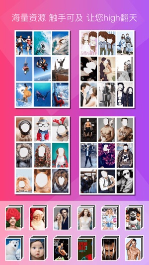 想瞬间让自己或对方焕然一新么,没错,在这里,您就是换脸大师! 您可以一跃成为高富帅,可以秒杀一众小鲜肉,也可以一展自己搞笑天赋,甚至让心动的对方瞬间变为全新的人。让您指尖一弹即可实现梦境中的场景,还犹豫什么,赶紧玩转吧! ===软件特点: 1. 海量模板:节日,搞笑,街拍,婚纱,美女走秀,肌肉型男,极限挑战,明星海报等等 2. 高清图像质量:照片合成保存为高清图像,适用各种场景 3. 支持图像肤色调整,可以更好的让您的照片和背景进行融合 4. 轻松分享: 随时分享您的变身效果,搞笑炫酷,High爆朋友圈