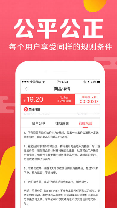 天天竞拍,一个颠覆传统拍卖规则趣味无穷的全新应用。 革新竞拍模式让你以成本加10%的价钱拍下你想要的商品。 给您提供一种惊喜不断充满激情的拍卖过程。 【竞拍规则,10秒竞拍】 全场商品0元起拍,每拍一次价格只上涨0.1元,10秒内无人竞争,您即可以前所未有的低价带走心仪商品 【海量商品,任君选择】 最新手机电脑、数码照相、金砖珠宝、护理化妆、日常家电,上千种最新、最潮的商品应有尽有,想拍就拍! 【过程透明,公平公正】 已有3215万用户晒单分享,91%用户拍下商品低于市场价1折。一款真正的用零花钱即可实现您的购物梦想的全新应用, 【新人福利,注册送5拍币】 注册立送5个拍币,助你竞拍心仪商品。 (特别声明:本应用所有活动与内容跟苹果公司无关)