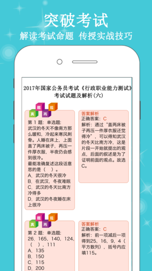 公务员考试-申论行测|事业单位考试题库 专业公务员考试教育机构打造的一款集做题、练习、考试于一体的公务员考试题库神器,网罗历年真题、名师精选高频考题、10万道专项题库,丰富题目任你刷: 1、2015、2016年、2017年火爆公务员考试题库,汇集近10年公务员考试真题、模拟题。 2、全力打造,丰富的公考经验,营造完美公务员考试题库 3、详尽解析,让你公务员考试题目一看就会 4、方便做题,合理利用碎片化时间随时刷题 强大的功能介绍给你听: 1、【真题演练】公务员行测历年真题下载功能,让你畅游公务员考试题海 2、【竞技赛场】和小伙伴一起做题同进步 3、【考点直击】让公务员考试行测复习有方向 4、…