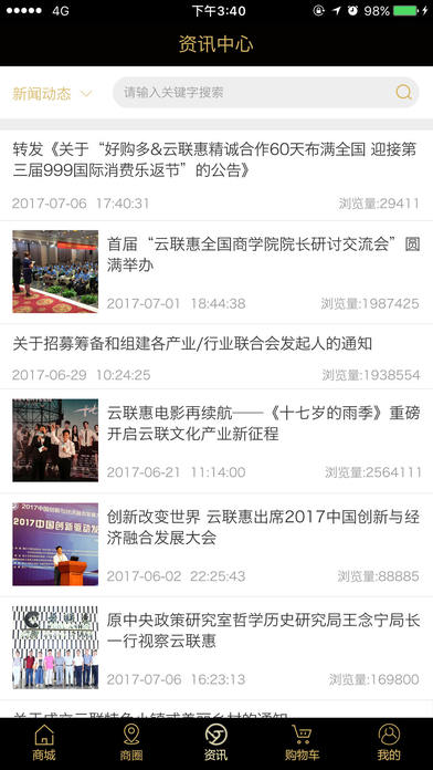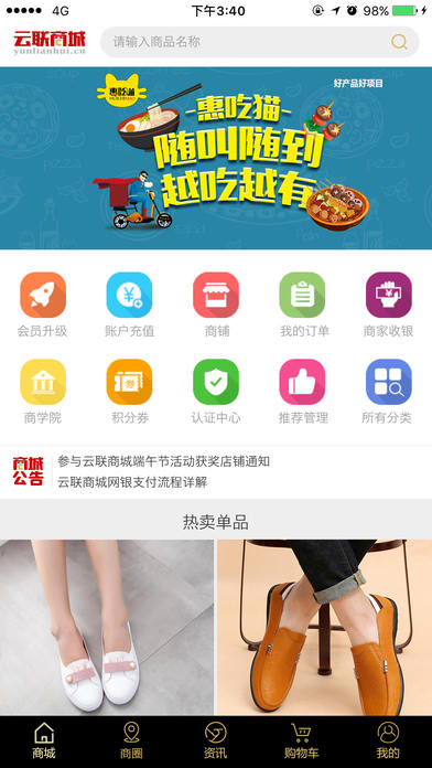 广东云联惠网络科技有限公司(以下简称:云联惠)由广东本土民营企业家黄明先生投资创建,于2014年1月在广州工商局注册成立(目前注册资金为100001万元)、2015年4月正式上线运营(网址: www.yunlianhui.cn),是一家以经营消费资源(消费商)为主要内容的创新型电商平台公司。 云联惠总部位于广州市第三中轴线与珠江黄金岸线的交汇处——海珠区保利叁悦广场,已先后在中国大陆大部分省、市、区建立代理公司,并将在香港、台湾、澳门、美国、韩国、新加坡、马来西亚、澳大利亚等地筹备组建云联惠分支机构和办事处。 云联惠秉承“为客牟利,促进销售,培养行业领袖;传递财富,传承共赢,传播事业博爱”的企业发展理念,顺应近年来经济和社会发展亟需变革、创新和转型的潮流趋势,紧紧把握国内国际时尚生活主线,经过两年多时间的运作,已经发展成为一个国际化、多元化、系统化、专业化的国际商业互动消费创业型全新企业,为推动中国全面建设小康社会、实现“中国梦”发挥直接有效的促进作用。 有任何意见或建议可通过以下方式联系我们: 联系电话:400-8601-999 联系QQ:4006632999 【主要功能】 1、注册/登录 2、买家进行商城购物,订单管理 3、卖家中心的店铺管理及订单处理 4、个人资料的修改 5、现金账户和积分账户的查询与操作 6、账户安全设置 7、在线收银 8、认证管理 9、推荐会员,查看推荐会员 10、资讯中心文章查看