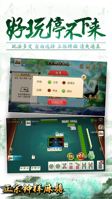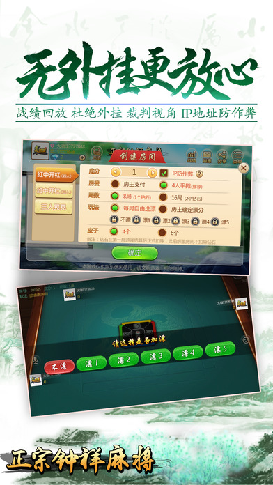 游戏介绍 【最稳定】大厂出品,确保游戏过程更加稳定,专心玩游戏,没有掉线卡顿烦恼。 【最好玩】再也不用苦于配桌,全民手机时代,你可以再手机上随时随地和亲朋好友搓麻将,是传统麻将馆的有力补充。和亲朋好友一起开房,决一高下吧! 【最地道】最地道的钟祥麻将,晃晃、红中开杠(四人)、红中开杠(三人),原汁原味,让广大钟祥麻友能够在手机上畅玩属于钟祥自己的麻将。 【最靠谱】可以录像回放,同IP报警,杜绝外挂,真实可靠。 【最智能】智能提示、界面大方更具人性化,支持智能单独、分开支付房费。