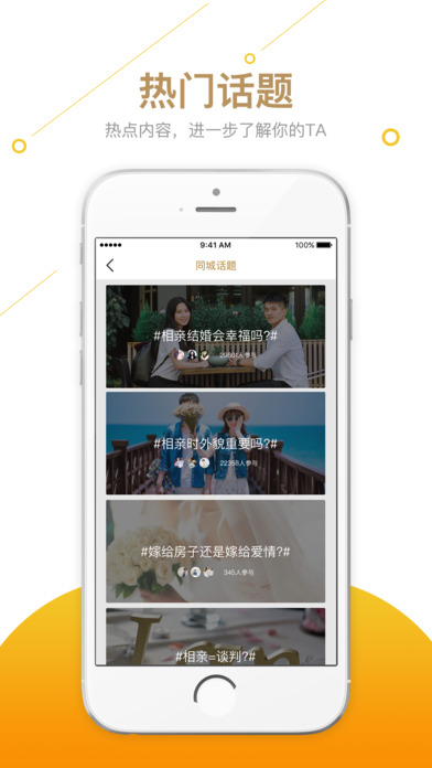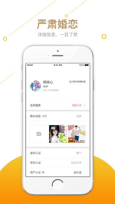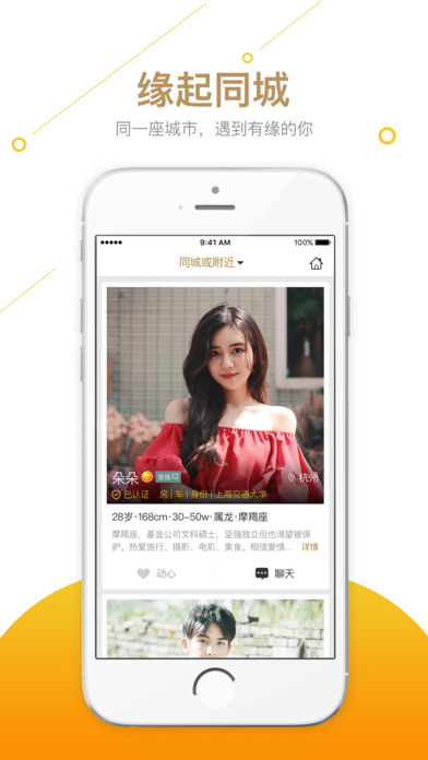 同城婚恋--单身离异的都在用的高端精英同城约会平台 在同城婚恋所有会员都必须真实身份认证所以在这里放心去恋爱吧 [问答] 同城婚恋是什么? 同城婚恋是为有明确结婚计划的优质单身人士提供一个高品质征婚相亲的婚恋平台,全新的实名制认证交友模式,让会员的交友环境有一个真实安全的保障。平台采用身份认证、学历认证、资产认证的模式杜绝酒托,婚托等诈骗行为,保证平台内的会员都是以结婚为目的,通过实名认证、资产认证的方式彻底的和探探、陌陌等不严肃的交友平台区分开 同城婚恋认证会员如何? 1、本科及以上学历。 2、以海归、华侨、金融、外企,阿里巴巴、网易等名企业群体为主,多数有房有车,本科学历,具备结婚硬件条件。 3、同城婚恋认证会员有相似的优质生活方式。会员通过同城婚恋可以寻找到与自己合适的优质单身人士,建立美好的沟通,直到走向婚姻的殿堂。 功能亮点 1.实名制注册。用户在注册时候都将进行实名制审核,真实照片,人工审核。维护高品质的社区氛围, 杜绝婚托、广告等诈骗行为,多机制确保资料真实性。 2.首页:最美丽的认识从首页开始,直接查看会员的真实头像及信息,根据个人要求进行筛选在第一时间找到合适的人,喜欢的人可以直接收藏让对方知道你的心意。 3、消息:希望认识的会员可以直接给对方发送消息进行聊天沟通。 3、我的:个人详细信息的真实,会员信息都是经过严格的审核,可以在第一时间最真实的了解会员的个人情况。 网友评价精选 “好评!非常给力。同城婚恋是一个真实的交友征婚婚恋平台,用户都是白领精英,想找对象的不要错过。”by 世纪佳缘红娘网 “非常给力。赞一个!还不错!一款特别好的征婚交友婚恋软件。平时工作没时间,现在在网上就可以解决男票的事,真是太赞了。支持不错赞”by 爱上红娘没有去百合网 “通过豆瓣小组介绍来注册的,虽然认证比较繁琐一点,但是这样反而使用起来会很放心,用户也都是很真实,质量都很不错,比有缘网,花田,世纪佳缘的好多了,很多都是名校毕业,也有和我一样是海归国外回来的朋友”by-征婚相亲yy珍爱 “无意间搜索到这个软件,就下载来看看,不巧就看见了有喜欢的女生,试着去认证了,真的是不得不相信会员都是高品质的真实用户,审核也蛮快的,之后我就直接给我喜欢的女生发信息了,还蛮方便的”by--网易花田cc百合网 “哇塞美女高素质超级多,为我们这种单身人士提供了很多更多的机会百合网”by 花田红娘珍爱探探 “里面有我心仪的帅哥,条件也不错,征婚相亲还是不错,准备找机会见个面看看感觉礼物说”by--JOY百合网恋爱记