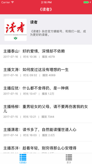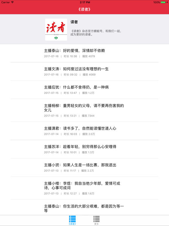 《读者》杂志创刊于1981年, 是中国具有广泛社会影响力、享有良好声誉的著名期刊。目前月发行量800万册, 居亚洲第一、世界第四位。自创刊至今, 《读者》杂志始终以弘扬人类优秀文化为己任, 始终坚持“博采中外、荟萃精华、启迪思想、开阔眼界”的宗旨和“高雅、清新、隽永”的风格, 赢得了海内外各个年龄段和不同阶层读者的喜爱, 累计发行近15亿册, 发行量连续15年位居中国第一, 被誉为“中国人的心灵读本”。