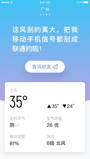 嘿,我是小明,首个“人工智能”超级天气App。 天气好能带你出去浪,不好能提醒你早预防; 我不会宽慰你天气还不错,只会告诉你今天有多热; -未来24小时天气预测 上班、约会、旅行、聚会,哪样都不耽误你; -未来7天天气预测 该不该洗车?订不订飞机?统统告诉你; -用气象学知识武装你 谈天说地更教你天气原理,聊天气也能装逼; -东边日出西边雨 准确预测同一个城市不同区域的天气; -精准灾难性预警 洪涝、台风、冰雹、大暴雨,同步国家气象局; -关注亲朋好友所在城市天气 一键分享,提醒好友天气情况 我是小明,最智能天气APP,等你来撩!