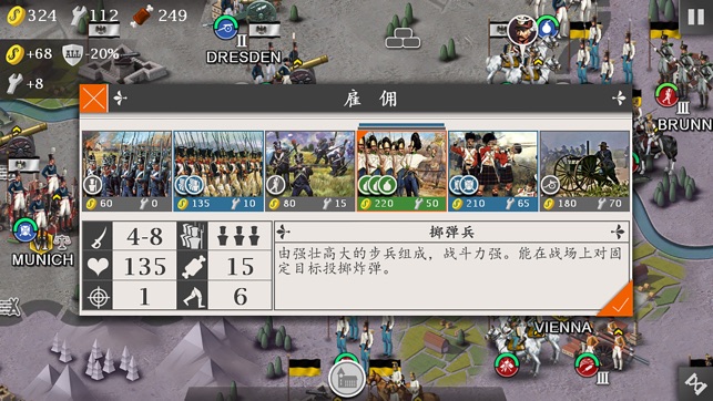 指挥官阁下!欢迎进入18世纪的拿破仑时代。 全新的游戏模式,加入了将领的技能和新的物品系统。 共有200多个名将登场『拿破仑,缪拉,威灵顿,纳尔逊,拉纳,库图佐夫,华盛顿...』 每个将领都可以从列兵晋升到元帅,由平民变为皇帝。 战场上每个部队都有自己的特点,如果你熟练的使用他们将战无不胜。 部队会积累战斗经验,当成为王牌部队后它们的战斗力将大大增强。 全新设计的地图系统,支持地图无缝缩放,各国的势力范围和国界线清晰可见。 在战场上除了运用战术击退敌军,还可以在商店中购买物品,在酒馆中招募将领,在市场上兑换物资。 【战役模式】 6大战区 84个战役。 『帝国雄鹰』『…