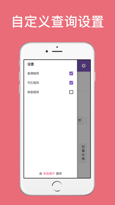输入你想押韵的字后,会列出所有押韵的字——几乎涵盖了所有的常用字和冷僻字。 还会列出提供大量押韵的词汇和短句,启发你的灵感。 将来还会列出押韵的经典诗词、名著句子、网络流行语等。 这款APP可以提高你文案创作、诗词写作、金句创作的效率。
