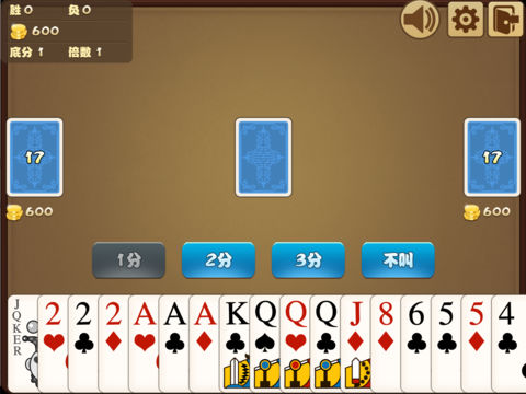 由三人个玩一副牌,地主是一方,其余两家为另一方,双方对战,先出完的一方胜。 牌型: 1、火箭:即双王(双鬼牌),什么牌型都可打,是最大的牌。 2、炸弹:四张同点牌。如四个5。除火箭和比自己大的炸弹外,什么牌型都可打。 3、单牌:单个牌。 4、对牌:两个点数相同的牌。 5、三张牌:三张点数相同的牌。 6、三带一:三张同点牌 + 一张单牌。例如:三张3+单4 7、三带二:三张同点牌 + 一对牌。例如:三张3+对4 8、单顺:五张或更多连续的单牌。例如:单3+单4+单5+单6+单7。不包括2点和双王。 9、双顺:三对或更多连续的对牌。例如:对3+对4+对5。不包括2点和双王。 10、三顺:二个或更多连续的三张牌。例如:三张3+三张4+三张5。不包括2点和双王。也叫飞机不带翅膀。 11、飞机带翅膀。三顺+同数量的单牌(或同数量的对牌)。 例如:三张3+三张4+对5+对6 或 三张3+三张4+三张5+单6+单7+单8 12、四带二:四张牌+任意两张单牌(或任意两对牌)例如:四张5+单3+单8或 四张4+对5+对7 牌型的大小: 火箭是最大的牌。 炸弹,除火箭和比自己大的炸弹外,比其它牌型都大。 对一般牌型而言,只有当牌型相同和总张数相同的牌,才可比较大小。 其中像三带一、三带二、飞机带翅膀等组合牌型,只要比较其牌数最多牌值就行。只有比当前出的牌(场牌)大的牌才能出。 发牌: 一副牌,留三张底牌,其他发给三家 叫牌: 首先系统翻出一张明牌,获得明牌的人开始先叫牌,每人只能叫一次,叫牌可以:1分、2分、 3分或不叫,叫完后叫的最大的为地主。 出牌: 首先将三张底牌交给地主,三张底牌所有人都能看到。由地主开牌,然后按逆时针顺序依次出牌,论到你跟牌时,你可选择PASS或按规则出牌。直至某一方牌出完就结束此局。