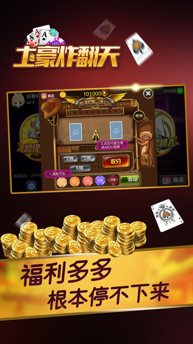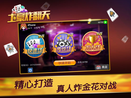 “我全压,看你打的过我么” “怕你啊,你敢上我就敢跟” “你炸人的吧,看你牌” “咚咚,搞惨了” “哈哈......” 还在斗地主,斗牛么,想体验刺激的游戏吗,那就来土豪炸翻天吧,这是芽豆工作室耗费半年时间精心打造的一款真人玩家之间斗智斗勇的炸金花同花顺游戏。 在土豪炸翻天中,可能牌小诈走牌大,是实力、勇气和智谋的较量,是冒险家的游戏。 ◆ 游戏特色: 1.每日登陆可领取工资 2.如金币不足,系统每隔一个小时自动补充,用户免费可以畅玩 3.界面精美,操作简单,上手很容易 4.带有丰富得聊天系统,玩家既可以玩游戏,更可以交到好基友 5.联网真人比赛,流量消耗少 6.稳定流畅,在网络条件不好的情况下也能流畅的运行 土豪炸翻天游戏由2-5人同时进行, 使用一副扑克牌, 在去掉大小王的同时,一共是4个花色52张牌。玩家以手中的三张牌比输赢,游戏过程中需要考验玩家的胆略和智慧。 牌型说明: 豹子:三张点相同的牌,AAA最大,222最小。 同花顺:三张花色相同的顺子,同花色AKQ最大,同花色A23最小。 同花(金花):三张花色相同的牌,非顺子,AKJ最大,352最小。 顺子:三张花色不完全相同同的顺子,AKQ最大,A23最小。 对子:两张点相同的牌,AAK最大,223最小。 单张:三张牌不组成以上任何类型的牌,AKJ最大,352最小 大小规则: 1. 豹子>同花顺>同花>顺子>对子>散牌。 不同花色的235>AAA 2.牌点中,2为最小,A为最大。从大到小依次为:A、K、Q、J、10、9、8、7、6、5、4、3、2。 3. 同种牌型,顺序比点,如牌大小完全相同,主动比牌者输。 4. 从第一个叫牌者开始,逆时针开牌,相同牌,先开者输。 游戏术语: 锅底:发牌后第一把每位玩家投入的初始筹码。 投注额:每次投注的金额,每局有最大投注额。 封顶:每局总投注筹码总和的上限 ,达到封顶后,本轮结束时自动开牌 暗注:不看牌投注筹码 明注:看牌后下注,筹码是暗注的2倍。 跟注:投入和上家一样多的筹码。 加注:在上家投入的基础上增加投入注。 放弃:玩家自动弃权,放弃已投注的所有筹码,判输。 喜金:获胜方如是豹子和同花顺,则其他玩家需额外支付金币。 游戏规则: 投入锅底 发牌之前大家先付出的游戏筹码。 发牌 一副牌(52张无大小王),从庄家开始发牌,第一次开局的话,随机选择一个用户为庄家先发牌。每人发三张牌,牌面向下,为暗牌。 游戏 游戏人数为2-5人。从庄家开始下注,其他玩家依次逆时针操作。轮到玩家操作时,玩家根据条件和判断形势可以进行加、跟、看牌、放弃、比牌等操作。 看牌 a. 没有选择“放弃”的玩家,轮到自己动作时,可以选择看自己牌,可以在看牌后再选择是否跟、加,或比牌。 b. 游戏中放弃的玩家,在结束游戏前无权查看自己的牌和其他玩家的牌。 比牌 a. 从第二轮开始,玩家在投注前可以选择“比牌”。 b. 比牌双方进行比牌,所有玩家看不到两人的牌面。 c. 牌型牌点相同时被比牌方胜。 跟注、加注 a. 每次跟注、加注,单注均不可超过单局约定的“跟注”“加注”上限--即游戏房间内最大筹码,也就是顶注。 b. 当选择“加注”时,加注框顶端会显示这一手加注数值。 胜负判定 a.只剩下最后一个玩家,其他玩家比牌输,或弃牌,最后一个玩家赢 b.总筹码达到封顶的情况下,本轮结束自动开牌,按大小规则,最大一方为赢家 c.赢家得到本局总筹码 放弃规则: 游戏操作超时为放弃,丧失已经下注的所有筹码。 ◆ 温馨提醒:适度游戏,坚持锻炼,享受生活! ◆ 客服QQ:2876492120。