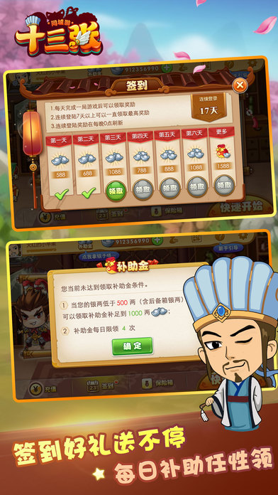 独具匠心的游戏设定,简单、方便、快捷的游戏体验,2017最新版十三张游戏强势来袭。新刺激、新体验、新感觉,多样化的游戏功能给您在枯燥的生活中注入新的活力。十三张,盛行于华东、华南一带的牌类游戏。无论您是否在现实中体验过十三张游戏的新手,还是熟练的十三张高手,当您接触过这款产品都会找到适合您的牌桌尽情游戏,赶紧畅快享受一回吧! --------------------------游戏特色-------------------------------- 【精美画面,挑战三国名将】 精细的人物刻画,精美的界面设计,尽享指上激情! 三国名将与你比拼牌技,精妙摆牌,运筹帷幄! 【单机/联网双模式】 没网络?不用愁!练习场让您0流量随意畅玩! 玩上几盘,减压舒缓心情,心情好,一切顺! 【火爆人气,福利多多】 福利天天送,还有活动奖励,边玩边拿,让你赢得更爽! 公平的游戏环境,人气爆棚,赶紧下载感受胜利的快乐吧!
