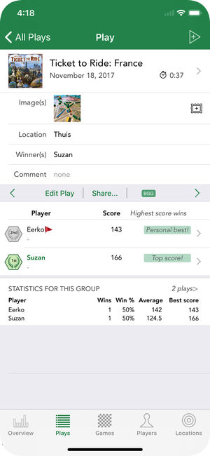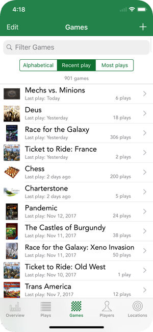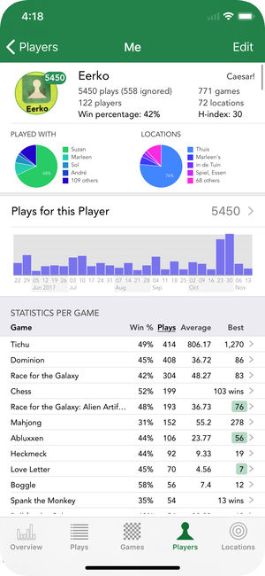 Keep track of your Board Game plays and scores in this easy to use tool. View statistics and graphs for your games, plays, and other players. - How many games did you play recently? - Who scored the highest for a game? - With whom did you play and who wins more? - Did you improve your score from la…