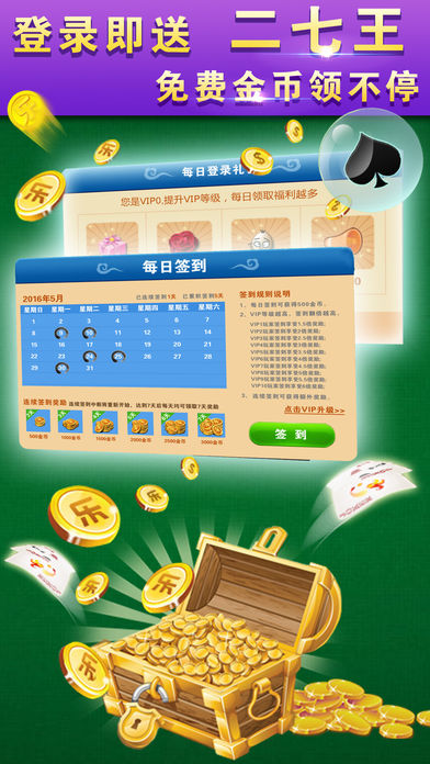 二七王游戏棋牌平台,万人在线,每日大奖赛,金币领不停,同城乐二七王是地道的二七王本地打法。二七王采用的是3D场景技术,是用户体验舒适的棋牌手游!同时二七王还支持互联,可以和朋友同时在线玩地道的二七王。三人二七王简单说就是二打一的拖拉机游戏,游戏规定大王,小王,2,7为常主,故名二七王。 一、牌数 二七王打2副牌,去除3和4,共计,92张. 二、术语 分牌:升级游戏中每张 5 、10 和 K 是分牌, 5 代表 5 分, 10 代表 10 分, K 也代表 10 分,一副牌共有 100 分,两副牌共 200 分。 底牌:打两副牌时每方得牌 28 张,剩余的 8 张牌为底牌。在确定庄家后由庄家取走底牌,而替换成庄家不需要的同样张数的牌作为新的底牌重新扣下。 主牌:主牌由大王和小王、2、7和主花色牌构成,大小顺序为大王 > 小王 > 7 > 2。 副牌:除主牌以外,其它牌都是副牌。大小顺序为A>K>Q>J>10>9>8>6>5. 对牌:两张同点同花色的牌称为一对牌。 三、游戏规则 3人游戏,始终打7,王、2是常主,8张底牌,必须主牌抓底,副牌不能甩。