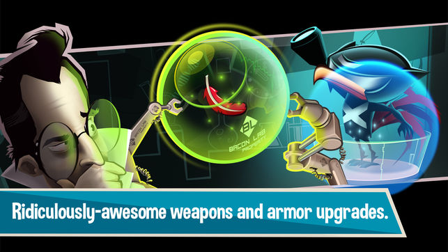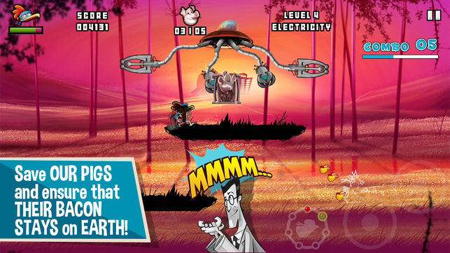 **** “A Swine-tastic Platformer” Touch Arcade **** The Abduction of Bacon at Dawn, the Chronicles of a Brave Rooster is an action and humor-packed platform shooting game for iOS. STORY The Earth is being invaded by hungry aliens that are abducting our pigs… But, why pigs?! Soon after the invasion…
