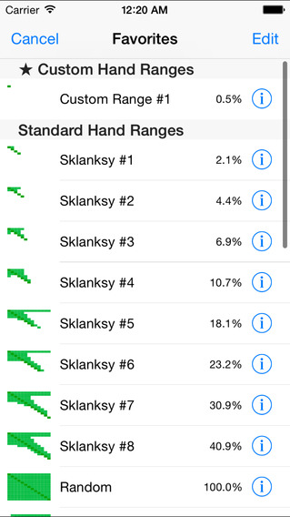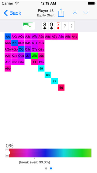 Poker odds taken to the next level... Hand ranges, hand rank stats, draw stats, equity heat charts, save hands, and more. Other apps can show odds of making a full house. This app can drill down deeper and see odds of each specific full house. Want to see breakdown of only the hands won? Now you can. Want to see breakdown of hands that use both hole cards? Now you can. Easy to use hand range editor and icons that look like mini-representations of hand ranges. Stats include equity percentages, win percentages, tie percentages, rank breakdown stats, draws breakdown stats, equity heat chart, and best overall hand stats. Main Features: 1. Calculates odds for up to 10 players. 2. Assign cards, random cards, or hand ranges. 3. Calculates equity %, win %, tie % 4. Calculate to: pre-flop, flop, turn, or river 5. Easily fold players 6. Dive down feature in hand rank, best hand, and draw stats to get more in depth data 7. Equity heat chart 8. Swipe to delete player. 9. 27 Built-In Hand Ranges 10. Create and store infinite number of Custom Hand Ranges 11. Save hands for future reference. 12. Twitter and Facebook Integration