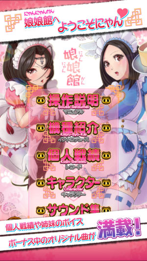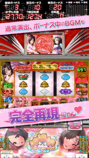 【アプリの特徴】 岡崎産業×D-Oが送る最新パチスロ「娘娘娘~にゃんにゃんむすめ~」が iOS アプリで登場! オートプレイ、ウェイトカット、強制フラグもフル実装! 更にアプリオリジナル要素として、お楽しみ特典いっぱいの娘娘館もオープン! 娘娘館ではオリジナルビジュアルや、魅力たっぷりの3種類のボーナス曲、姉妹のキュートなボイスなど各種サウンドもご用意。 娘娘ボーナス専用曲「召しませ姉妹開演」は実機未搭載の2番も聞けちゃう! 可憐な姉妹と一緒にアプリを楽しもう! 勿論システムも魅力満載! 1/108(設定1)~1/72(設定6)という確率の甘さだけでなく、1G連や全ボーナス終了後の5ゲームの…