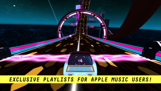 Nominated 'Best Racing Game' TIGA Awards 2016. Race futuristic arcade stunt race tracks automatically generated from your mp3s or race tons of songs from our APPLE MUSIC playlists!** Riff Racer also comes with 25 bundled tracks so you can jump straight into the action. TouchArcade 'Game Of The Week' - 3rd September * Only songs purchased from iTunes or imported (mp3 / CD etc) can be converted yourself with the 'convert track' option. Apple music subscribers can choose songs from our curated playlists in the Apple Music section. There's loads of songs across multiple genres. We're adding new playlists all the time. ** For Apple Music playlist support, you must be an Apple Music subscriber, you can sign up for a trial in game. Riff Racer is designed to work on iPad 3, iPad Mini 4, and iPhone 5s and above. GAMEPLAY: A fresh twist on music-powered game creation. Action on track is synced to the audio, you literally have to race the music to stay in sync and score points. Score big by pulling off jumps, drifts and rolls! Be the first to 'create' a race-track from a song and have your name forever enshrined on the track’s leaderboard. Challenge other racers ghosts. Have you got what it takes to be number one on your favourite songs? REVIEWS: Gorgeous... Hugely enjoyable - 4.2/5 - Apple Magazine Utterly smashed my expectations... A complete stunt racing title, which looks as unfathomably awesome as it sounds - TouchArcade Clever with gripping effect - The Guardian “Riff Racer is a fantastic bit of fun. I'm pretty sure at one point I didn't blink for an hour, and the game was so engrossing I didn't even notice.” IndieGames.com “Riff Racer is an incredibly fun thrill ride... Has everything it needs to become among the greatest music games.” 8/10 - Gaming Bits