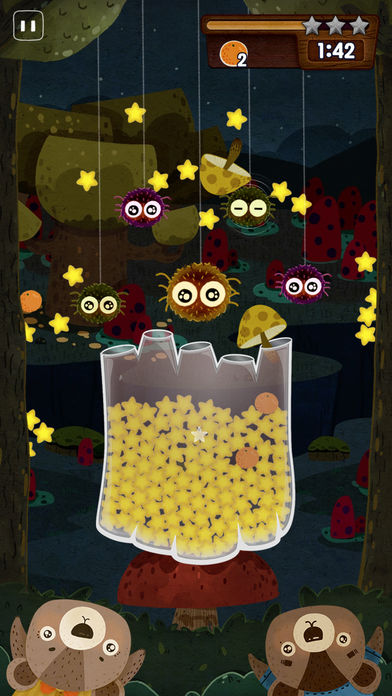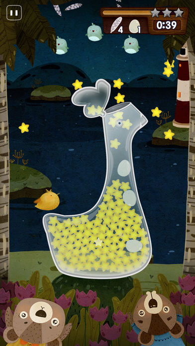 • ADC 96th Annual Awards 年度设计金奖 • 由荣获2012年全球苹果年度设计大奖的设计团队倾力打造! ►背景故事: 一个晴朗的晚上,熊哥哥和熊妹妹发现窗外掉下来很多星星。两个人兴奋的跑出去,熊妹妹刚刚捡起一颗星星,星星很快就碎了!聪明的熊哥哥从家里拿出一个透明的玻璃瓶,用嘴把星星吹进了瓶子里。星星在瓶子里闪闪发光,兄妹俩开心极了,每到夜晚来临兄妹两人就开始了他们收集星星的冒险旅程。 ►游戏玩法: 本游戏是通过重力感应操控游戏。游戏中,点按小熊把星星吹起,摇晃、倾斜屏幕控制星星下落方向,在规定时间内统计玻璃瓶收集星星数量判定游戏输赢。(点按主角的力度可控制吹气的力度) ►游戏关卡: 游戏分为四个世界,分别为:村庄、森林、海洋、珊瑚岛。每个世界分别有16个小关卡,每个小关卡有两种难度级别。一个世界完成后能解锁一个独有的冒险模式。