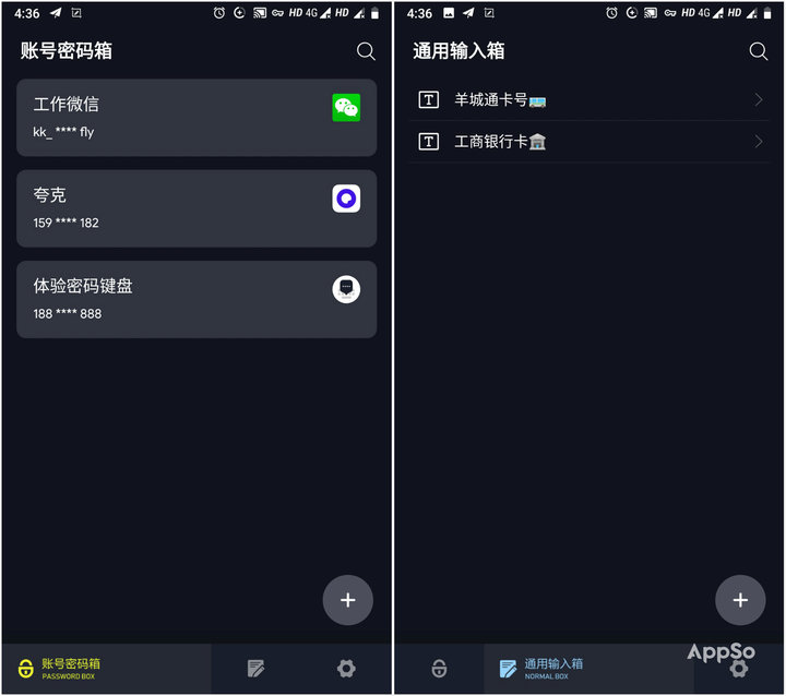 密码键盘提供了账号密码箱和通用输入箱共两个数据分类,其中密码箱可以用于保存手机上各种应用程序的账号密码,通用输入箱则可以保存身份证或者银行卡等个人隐私信息。
