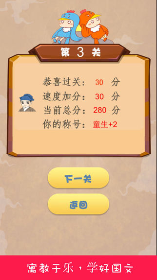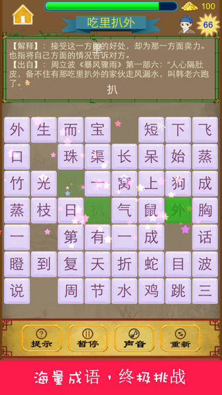 像消灭星星一样消除成语,让文字随星空划落。边玩边学,妈妈再也不担心我的学习啦,学妹再也不叫我学渣了!开心消消乐, 天天消消乐,消灭星星,如此多无脑消除游戏你是否觉得已索然无味,成语消消乐让你回到童年时光,体味成语与消灭星星的趣味碰撞。 成语消消乐是一款精致的猜成语益智游戏,规则很简单:按顺序选出一个四字成语即可消除。我们从成语词典里精选近3000个常用成语,设计140个逐步增加难度的关卡,等你来赏玩和挑战。游戏加入了大量动画和趣味元素,使得游戏生动耐玩。在一个成语成功消除后会显示其成语的解释和成语典故出处, 每关结束后,会展示一个成语故事,成语典故,真正做到在学中玩,在玩中学。 游戏加入了古代读书人升级制度。从童生到状元,你是否能一站到底,成为真正的成语英雄?目前中国文化大热,电视台相继推出中国成语大会,中国汉字听写大会,中国谜语大会,成语接龙游戏,目的就是在于弘扬我中华文化。成语作为流传至今的四字词语,是中文汉字的魁宝,理应被我辈熟练掌握。我们的目标是做最好的中国文字益智游戏,希望得到您的反馈,我们将会做得更好。 最新版本加入了每日登陆奖励,即刻下载,体验最有趣的文字脑力挑战。