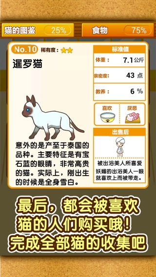 从今天开始成为猫咖啡店的经营者吧! 就请从购买小猫开始,努力的饲养。 但是, 为了猫咖啡店的发展,需要资金。 所以要把努力饲养的小猫出售赚取资金。 把饲养许多的小猫后,建成出色的小猫咖啡店, 成为出色的经营者吧。 ◎游戏方法 1.购买小猫仔 所有的猫都是从小猫仔开始饲养! 有各种颜色的小猫仔,要饲养哪个还真是苦恼啊^^ 2.小猫的饲养 充分灌注我们的爱心来饲养吧。 快乐地期待它们的成长吧! 3.出售小猫 终于到了要悲伤告别我们饲养的小猫的时刻了。 因为倾注了我们的爱心努力饲养,所以对于出售也要认真对待哦。 出售到哪里都会来报告的! ◎猫的成长 在猫咖啡店里饲养小猫仔们成长为各式各样的猫。 虽然原因不是很了解, 但是越是稀有种类的猫越是被高价收购哦! ◎提供食物 小猫对食物有各种各样的喜好。 真是任性啊。。 但是,都是可爱的小猫仔们,就宠爱它们一下,根据他们的喜好饲养吧。 ◎生病!? 保持猫咖啡店的整洁是很重要的工作。 偷懒没有打扫,猫的毛落了到处都是的话, 猫们有可能就会生病… 不能让这么可怜的事情发生对吧? ◎物品 为了小猫们的成长,准备了许多的物品! 每一个物品一定都能为猫咖啡店经营的扩大有所帮助! 猫咖啡店的经营者的生活就从现在开始吧! 建立一个属于自己的出色的猫咖啡店吧^^