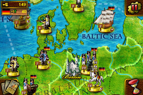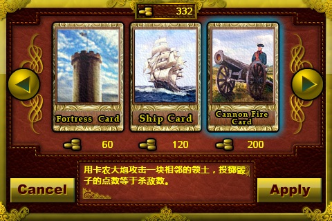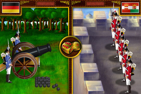 欧陆战争(火枪与大炮)是一款iPhone和iPod平台上的新型策略类游戏,把你带到18至19世纪充满战火硝烟的欧洲大陆。在欧陆战争的世界中,要想打倒其他势力,征服整个欧洲大陆,你得灵活运用各种策略。 游戏中登场的主要有六个帝国:英国、法国、德国、俄国、奥匈帝国、土耳其帝国,征服模式中你可以选择任意一个进行游戏。占领新的领土可以增加税收,如果把敌国的首都占领,那么该国的其他领土也归你所有,税收也是如此。税收可以用来购买卡片(征兵卡、将军卡、元帅卡、炮兵卡、堡垒卡、炮击卡,以及每个国家都有特殊技能的卡片等等)。 游戏系统: -60余种不同的军队造型,充满真实感的欧洲地图以及海洋。 -包括5个难度模式(让游戏充满挑战)。 -包括6张普通卡和6张国家特有的特殊卡。 -包括2个战斗模式:征服模式和战役模式。 -征服模式:从6个主要国家中选择一个打败其他5个国家,征服整个欧洲大陆。 -战役模式:重现欧洲历史的三个著名战役——土伦战役(Battle of Toulon)、奥斯特里茨战役(Battle of Austerlitz)、马伦哥战役(Battle of Marengo)。 -72块领土(包括首都和海洋),每块领土都有其税收。 -独特的战争策略游戏,其战斗特点(简单、丰富、充满乐趣) 操作的舒适性让你能更简单地进行游戏,更有趣味性。