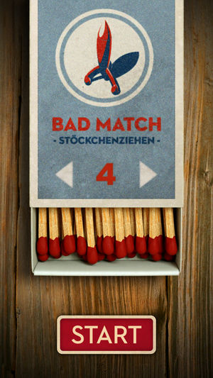 BAD MATCH Stöckchenziehen – THE ORIGINAL! Now ready for iOS 11 Including new lovely features! That's how important decisions are made: pull a match! It's that easy: The one who pulls the "Bad Match" is the loser. For all the difficult moments in life: Who takes out the garbage? Who is talking to t…