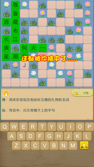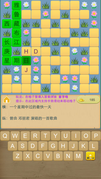 填字大师是一款花园小清新类中文填字游戏,画面清新不伤眼,题目超多完全免费等你来。被多个安卓国内市场推荐,小米应用商店同类游戏第一名。现登陆ios平台,努力做最好的知识竞赛,汉字猜谜游戏。 这款填字游戏操作简单,你只需键入每个汉字的拼音首字母,谜底自然为您揭晓。填字题目全部通过我们精心挑选,保证有趣。从唐诗宋词到金庸小说,从周星驰电影到最新的科技成果,几乎无所不包。画面精致,引入花园概念,让你做题的时候宛如进入花园迷宫。 1. 点击空格,下方会显示所在词条的提示信息,包括横向和纵向信息 2. 根据提示信息,填入汉字的拼音首字母 3. 当一个词条填完如果正确,格子会变成相应的汉字并且全部变绿,意味着答案正确 4. 当此关卡的题目还剩下3条时,自动解锁下一关。 5. 实在不知道,可以按“提示”按钮,会显示相应答案哦。还可以百度搜索啦。 6. 每一关的填字数据都可以自动保存,没做完的关卡,下次进入会自动载入进度。 现在题目已经更新到200关,并且做了大量优化工作。好玩又益智的填字游戏,绝对是你居家旅游,课间休息,上班路上绝佳必备游戏。马上下载做学霸,成百科知识达人。