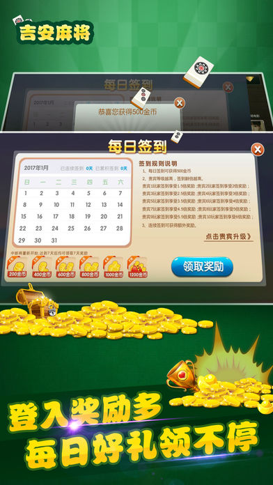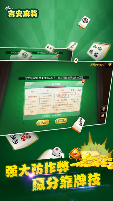 地道吉安麻将规则,新版上线,全新玩法。邀好友开设包房,一键直达包房,方便快捷,打积分随意畅玩。包房设有录像及回放功能,全程防作弊。每日大奖赛,签到领金币,万人在线陪你玩!