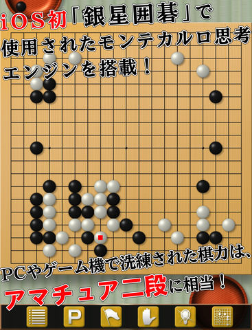 For the first time in iOS, is equipped with a Monte Carlo thinking engine that was used in the Ginsei Igo! Kiryoku sophisticated in PC and game consoles, equivalent to a two-stage amateur! Strongest of Go app Ginsei Igo hybrid Monte Carlo Anytime, anywhere, you can enjoy! ※ Ginsei Igo hybrid Monte Carlo is, It is a universal app that supports both iPhone / iPad. ■ CPU opposite station ■ Select a level from four levels of Beginner / Intermediate / Advanced / superlative, This is the mode for opposite station with a computer. Using the Monte Carlo thinking engine superlative level, Amateur is a two-stage equivalent of ability. ======================= The performance and opposite station settings, etc. of your terminal, Superlative level of thinking time I will change. ● Reference information ● Model: iPhone6 board: 19 Road thinking time: about 5 seconds per hand ======================= ■ 2P opposite station ■ It uses a single terminal, it is mode to perform the opposite station by hitting the stone alternately by two people. Even if there is no cross-cut and stones, is immediately available opposite station between humans. In addition, 2P opposite station mode not only opposite station, is also available to the input of the game records. It is convenient to input and viewing on the go. ■ game record store and resume function ■ Opposite station game record can be stored and read is. The number of saved game record is ordered and unlimited as long as you have any capacity. Saved game record is also carrying out a side by side later game record, you can also be resuming the opposite station. ■ Function in opposite station ■ Help in opposite station in the Ginsei Igo, a number of features have been installed. -19 Roadbed / 13 corresponds to the roadbed / 9x9 - Komi (by half a point to 0-7 eye and a half), can be set Okiishi (up to 0-9 children) - Equipped with will tell the next hand in opposite station hint feature - Willing to display and calculate the formation on the board formation Display is equipped with a function - Equipped with a joseki display function ■ various functions to achieve the nimble operation ■ 19 lightly in roadbed, and exactly the operation can be performed so that the various functions will support you. (※ 1) - Enlarge board in pinch out, equipped with a manual zoom function to shrink in the pinch (※ 2) - And to zoom around the once touched location of board, equipped with automatic zoom function then to hit the stone (※ 2) - To display the cursor on the board, position equipped with a cursor function that hit the stone to that aimed (※ 3) ※ 1: zoom function, the cursor function has become possible to switch function from Options. ※ 2: zoom feature has become valid only in the iPhone. ※ 3: cursor so that it does not hidden by the finger, will appear in a little distant point from the touch position. ■ Language ■ This app is compatible with Japanese / English / Chinese / Korean display. ▼ contact us from here ▼ support@silverstar.co.jp http://www.silverstar.co.jp/06support/iphone/