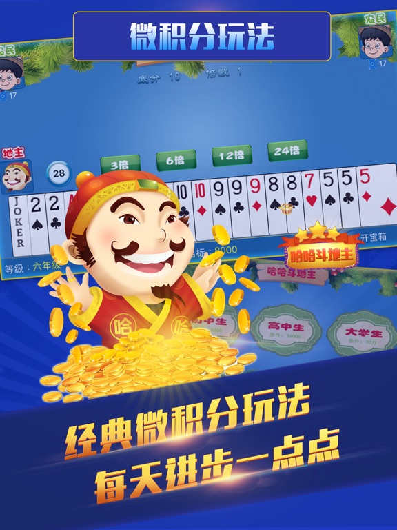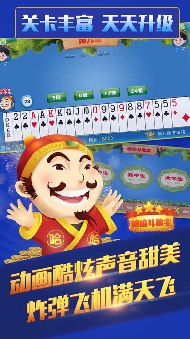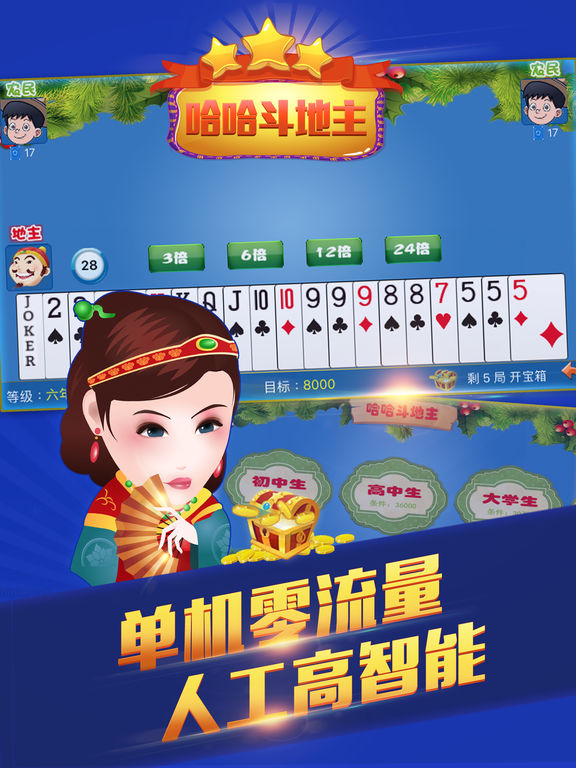 《哈哈斗地主》经典积分升级无广告单机版的特色: 1、单机零流量,零广告,加人工高智能; 2、做不做地主,决定权在玩家; 3、经典积分模式,虽然底分小,但资产不会出现大起大落的情况,金币每天积累一点点,稳中有升; 4、界面清新美观简洁大方,自然风、校园风、清新风交相辉映; 5、美女主播声音甜美可爱,百听不厌; 6、动画特效酷炫,玩了还想玩; 7、闯关升级玩法,关卡丰富,且相互衔接紧密,环环相扣,目标任务一个接着一个,越玩越刺激! 8、任务奖励丰富,金币元宝钻石奖不停; 特别提示:如果喜欢玩底金大点的玩家可以下载我们《哈哈斗地主》的兄弟版本:《哈哈斗地主》高底金高倍数版本!