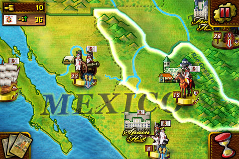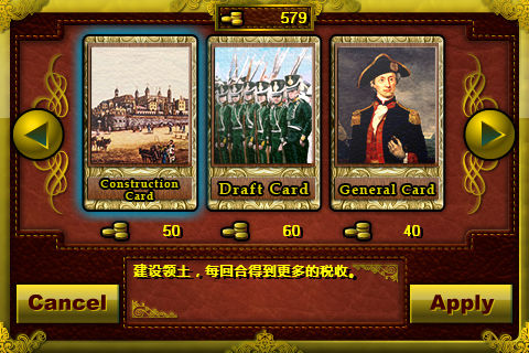 大炮与火枪(美国独立战争)是专门为iPhone和iPod touch开发的新型的战略游戏,他会把你带到美国独立战争的时期。在游戏中你可以使用很多战术击败你的敌方势力(可以使用经济模式和战斗模式)。 你可以在这场战争的2个阵营中选择6个势力中的一个,包含英国,法国,美国,黑森,德国,西班牙. 如果你得到敌人的领土你的总税收就会增加,如果你占领了敌人的总部,你可以获得敌人所有的领地,当然你也可以建设自己的领土获得更多的税收。 游戏特色: - 12张卡片 (建设卡 ,征兵卡,将军卡,元帅卡,舰船卡,堡垒卡,大炮卡…) - 5个战役( 3个史实战役和2个虚幻战役) - 采用增强的Risk类型战斗系统…