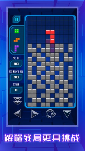 经典方块消除游戏全力回归,让儿时玩过游戏机的你重温经典,让现在是小伙伴的你感受经典!还有更多模式,更多关卡,挑战多多,乐趣多多! 一根手指,玩转游戏,操作简单,画面精美,音乐优美! 手指操作说明: 向左滑动:方块左移 向右滑动:方块右移 向下缓慢滑动:方块加速下落 向下快速滑动:方块直接落地 单击屏幕:旋转方块 同时还提供键盘操作,总有适合大家的操作方法! 经典模式,顾名思义为经典,以前怎么玩现在还怎么玩!关卡不重头开始,玩到哪里就可以从哪里开始继续玩! 解谜模式,考验智力,关卡多多,成就感爆棚! 残局模式,更是挑战自我,只有高高手,才能攀登最高峰!残局模式想要获取更多的过关星星,那么请…