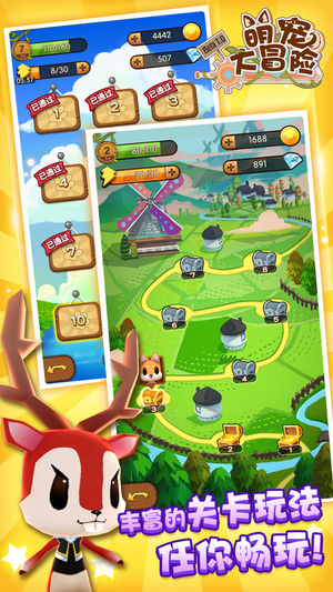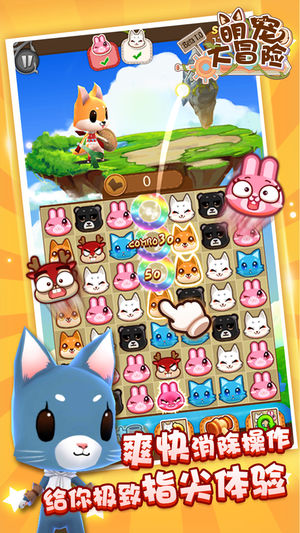 《萌宠大冒险》是2015年国内首款独具创新的三消RPG手游。可爱的呆萌宠物,华丽的个性装备,畅快的指尖操作,加上神秘刺激的闯关探险,给您带来不一样的三消游戏体验。 ===游戏特色=== 【可爱萌萌哒的宠物】 游戏中可选的6只宠物各具特色,天然呆、萌萌哒、卡哇伊应有尽有,搭配特有的装备换装系统,同一只宠物也能穿出五花八门的可爱造型,发挥你的想象力快去给宠物们造型去吧! 【RPG养成玩法】 萌萌的宠物不仅可以升级提升属性,还可以穿戴不同的装备,装备强化系统能让你的宠物装备属性更进一步,BOSS、怪物什么的轻松击败,小菜一碟! 【丰富多样的关卡】 探险模式关卡,关卡变化多端,不但要眼疾手快还要讲究…
