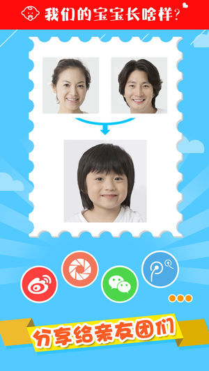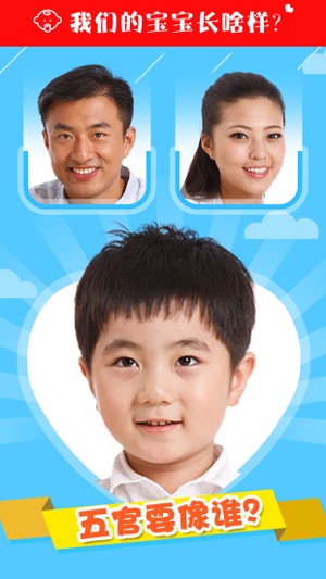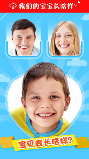你像知道你和你的另一半未来的宝宝长啥样不?或者你还想知道是男孩好呢?还是女孩好?你试试这个应用,你就知道答案了。 这个应用可以合成你们未来宝宝的样子。可以灵活定制他的五官,性别。 怎么用(非常简单): - 选择两张照片,可以从你的图库种选则,也可以现场拍照 - 放大或缩小照片到合适的大小,最重要的是正面大头照 - 点击按钮“开始预测” - 将结果保存本地,也可以发朋友圈炫耀一把 巨大的优化 - 小孩合成算法优化 - 增加了宝宝和儿童选项 - 界面美化 - 错误修正 - 增加了付费购买