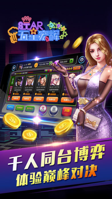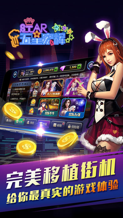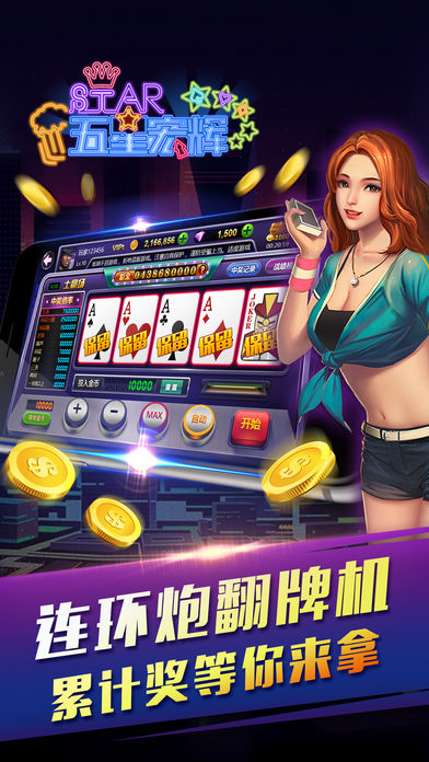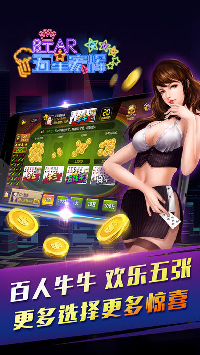 【游戏简介】 五星宏辉(也叫单挑王、黑红梅方、保单机、草花机、牌机、扑克机等),是街机厅和电玩城中的经典游戏。 每日畅玩最流行刺激的街机电玩特色游戏,绚丽特效,多人语音,随时随地,身临其境,让您爱不释手!现在下载还有更多活动抽大奖等著您!不要犹豫,赶快下载吧! 【游戏特色】 ◎ 最豪爽:每日签到奖励,连续登陆翻倍加赠,免费奖励都这么刺激! ◎ 最专业:权威经典翻牌机五星宏辉游戏规则,街机最经典玩法。 ◎ 最刺激:不仅有刺激的玩法,还有更刺激的活动! ◎ 最真实:全面社交化的翻牌机扑克机游戏,邀请土豪一起玩! ◎ 最贴心:7*24小时客服支持,爲您提供最便捷快速的专业服务! 【游戏种类】 ------ATT连环炮 - 最高48亿大奖等你来拿! ------多人猜王牌 – 比大小,赢大奖。 ------多人欢乐牛牛 – 谁是技巧之王? ------五星宏辉 – 经典街机黑红梅方玩法,开启刺激之旅! ------缺一门 – 原始扑克翻牌机,最新上线,不容错过! ------幸运五彩 – 幸运夺宝大奖等你来拿! ------财神到 – 玩财神到,开财宝箱,百万大奖! ------十二生肖 –十二种生肖代表不同的中奖标志,中3个或者3个以上“龙”标志即可进入彩金游戏! ------连环夺宝 – 珍珠宝石连不停,豪取2.5亿彩金大奖! 更多五星宏辉特色娱乐游戏不断更新中 ------丰富奖励系统,百万筹码送不停 每日签到大奖,在线奖励,任务奖励,升级奖励,超过万种中奖方式。 -------天天在线送好礼 任务奖励,升级奖励,活动奖励,超过万种中奖方式,让您不花钱也能尽情感受刺激的欢乐电玩城特色游戏! -------绚丽特效,多人互动 全新游戏界面,绚丽得游戏特效,刺激地游戏玩法,实时在线客服,尽享每分每秒的巅峰时刻。 -------玩法刺激,轻松上手 单手触摸操作,轻点即可开始游戏,全自动设计,玩家无需操作即可全天24小时玩游戏,畅玩游戏无阻碍。轻松交流无需打字,超低流量消耗。 【来就送】 每天上线,送金币!没有钱了,送金币!长期在线,送金币!只要你想玩,我们就会送! —还等什么,快约上你们的小伙伴来玩五星宏辉电玩城吧!