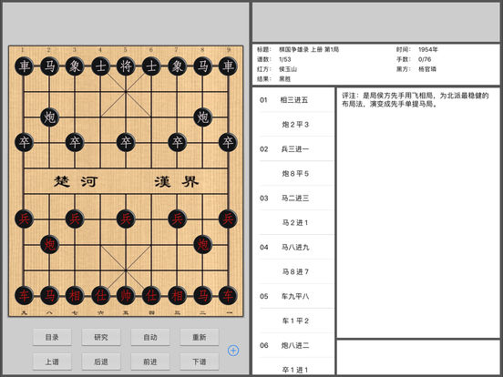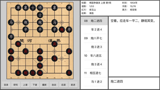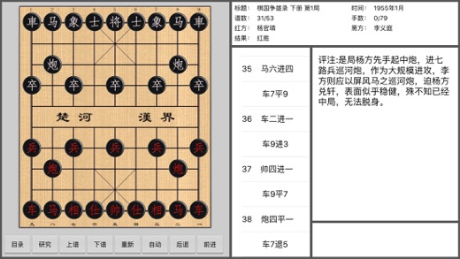 棋国争雄录免费版已经推出,欢迎下载! 《棋国争雄录》(上、下册)[评注+兰友按] 杨官璘编著 杨官璘的出现,在象棋坛上创造了空前的奇迹,他是中国自有象棋历史以来,成就最大的棋人。 为什么说杨官璘创造的奇迹是“空前”的呢?第一,他没有师承,棋艺完全是靠天才加上毅力,这在象棋名手中实在不可多得。而自己学棋,能达到他那样炉火纯青、前无古人的境界,更是自古以来,至此一人而已! 在《棋国争雄录》中,杨官璘将他与各方名手的对局,以及其他一流名手的对局,兼收并蓄,集取精英,详加评释,固可供读者揣摩,俾熟习各派大师的着法。是故既可作学习之资,亦可作棋坛文献。 本书还有一个特点是:每局之后都附有杨官璘好友王兰友的按语,对于战况经过,赛时气氛,都有极其生动的描述。当其在报上发表时,由于按语是根据每日战情写的,结果如何,常要看“明日分解”。其紧张之处,就有如读武侠小说一样。现在全书出版,读者对每个战役,更可观其全貌,读起来当可更增加兴趣。 软件功能: (1)棋谱单步、自动演示; (2)棋谱研究; (3)打谱和个人棋谱保存; (4)三种棋盘大小,可根据需要调整。
