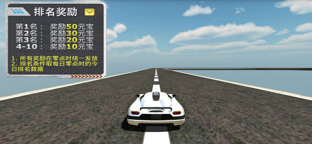 联网实时排名、实时交流,区别于单机游戏,你的游戏过程不再枯燥无味; 游戏中随机出现减速、转向炸弹,中了减速炸弹会在一定时间内无法加速;中了转向炸弹会在一定时间内左右转向键互换; 每日排名奖励元宝,元宝可用于每局游戏的复活,一局游戏复活次数越高,所消耗的元宝越多; 天宫赛车3D跑车版独有白色豪华赛车,实现你的豪车梦