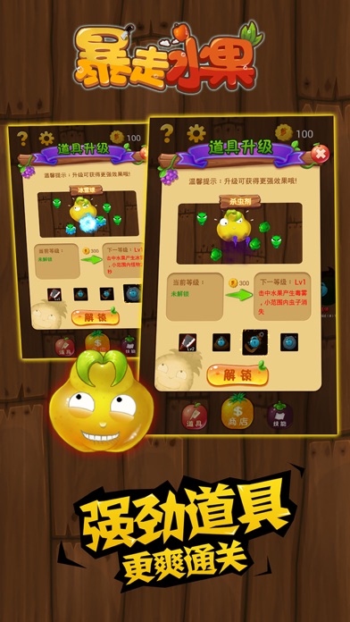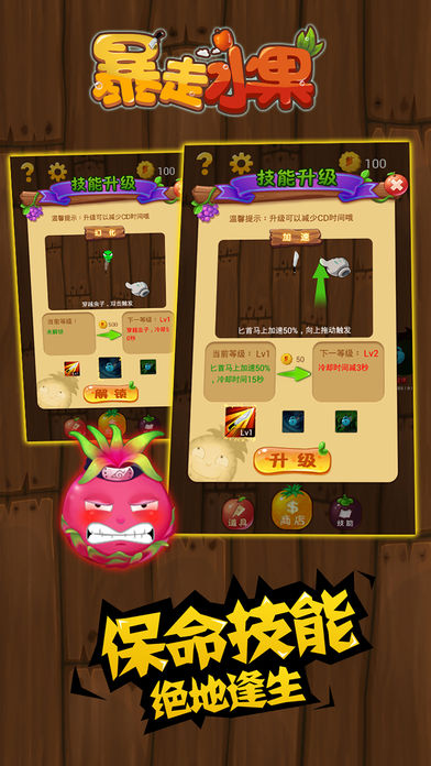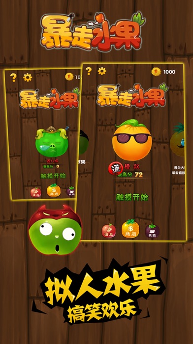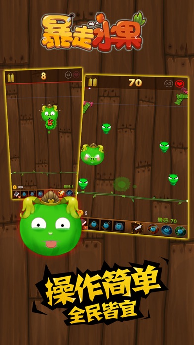 游戏简介: 《暴走水果》以水果因生虫子发飙嘲讽他人为题材,让人对雪梨,橙子,苹果、火龙果、桃子、西瓜、菠萝和番石榴八种水果八个关卡进行教训打爆为玩法的一款轻松搞怪休闲益智的小游戏。 游戏特点 1、 预判位置,攻击水果!简单粗暴的闯关游戏,玩家只要预判水果移动的位置,事先扔出武器击中水果即可,看起来容易,但十分考验玩家的判断力! 2、 使用道具,控制水果!游戏中可以使用大菜刀获得更高分数,使用冰雪球冰冻水果和虫子,使用便便泥缓慢水果和虫子,使用杀虫剂杀掉虫子! 3、 救命技能,千钧一发!加速可以使武器加速前进,弥补出手慢了的错误;减速可以使武器减慢前进,弥补出手快了的错误;幻化可以使飞出去的武器幻透明,避开虫子。 4、 轻松音乐,搞笑表情!怪物表情轻松搞怪,嘲讽能力极其强大,加上由世界名曲改编的轻松音乐,让你对怪物爱恨交加! 5、 成就高分,巅峰荣誉!每关都有关卡分数排行,也有总得分排行,争取让你在朋友与敌人之间达到人生的巅峰!