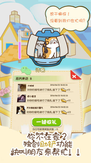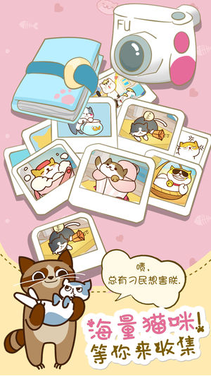 献给猫奴们的诚意之作 【游戏特点】 ■ 猫咪收集——数百种各色的猫咪等你来收集 ■ 好友串门——温馨猫宅可发至朋友圈,亲朋好友来串门 ■ 猫咪照顾——帮铲猫沙,帮洗澡,帮点赞 ■ 猫咪领养——和你中意猫咪培养好感度就可以领养到啦~海量萌猫等你带回家! ■ 萌猫大赛——挑选你最得意的萌猫和其他铲屎官去比赛吧,斗萌斗趣,谁家的猫咪最可爱呢? ■ 猫咪拍照——满足时猫咪会摆起POSE任你拍照,来张美美的照片吧 ■ 贴照片墙——美美照片墙,挂满了猫咪美照,与好友们共同分享 ■ 猫宅装扮——可装扮百变猫宅由你来布置,求温馨 ■ 家具收集——数百种各色的家具等你来收集 ■ 萌萌萌萌…