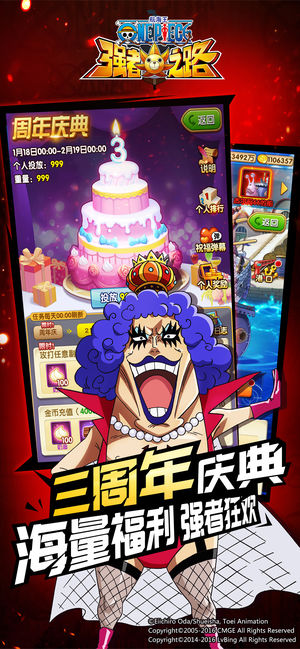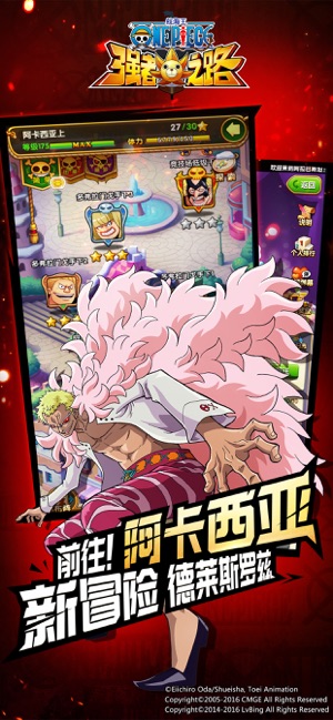 【游戏介绍】 ONE PIECE动画正版授权手游《航海王强者之路》三周年庆典!全新红卡爱德华·纽哥特登场,世界最强男人参上,这个时代名为白胡子!全新副本阿卡西亚开启,草帽一伙登陆德莱斯罗兹,挑战堂吉诃德家族,重燃航海王热血之魂!《航海王强者之路》三周年超强福利来袭,强者置换、全知之树、神官试炼、周年庆典隆重开启。超多游戏道具、珍藏头像框、海量金币大派送!进击新世界,成为航海王,周年狂欢等你加入! 【最强男人 白胡子登场】 世界最强男人,爱德华·纽哥特登场,这个时代名为白胡子!还原《航海王》顶尖决战热血场面,再现振动果实震撼实力!震碎空间,称霸伟大航路,ONE PIECE是真实存在的! 【全…