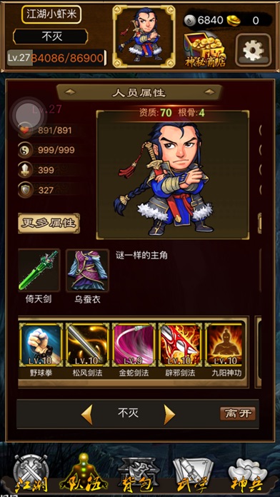 全自由开放式单机武侠rpg,游戏中场景自由进入,无所限制,随心所欲。玩家在游戏中的目标是收集全十四本天书,参加武林大会,回到现实世界。 在游戏中玩家可邀6位非主角控制的人物(NPC),参加队伍,而且游戏中如果行善做好事多,则玩家的品德属性值高,这样一些人物才愿意与你为伍。反之,如果杀戮过重,最后过关时将遇到正派大侠们连手攻击,就较难回到现实世界里来了。[1] 游戏中的经验值分为两种,一种是等级,可通过打败敌人得到晋级;一种是武学点,武学点可以提升使用的武功技能等级。