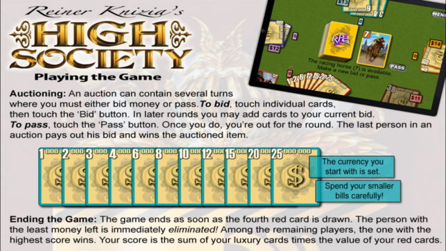 High Society is a card-based auction game of great deals and careful brinkmanship based on the tabletop eurogame by Reiner Knizia. Every player starts the game with the same amount of money to spend on luxuries and recognitions, but whoever spends the most money loses, no matter what they collected…