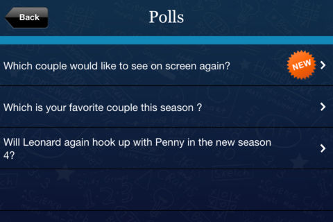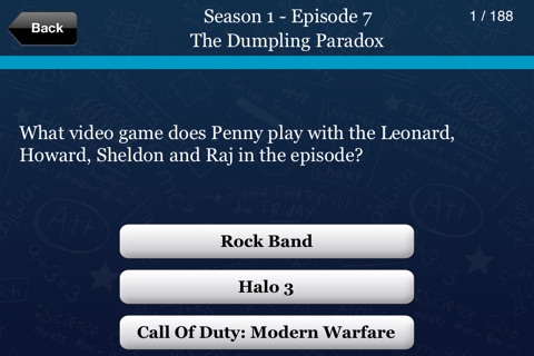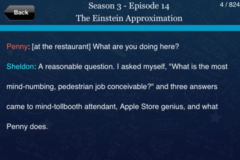Big Bang Theory Fan App Welcome to the Unofficial Big Bang Theory Fan App. The most watched TV Show on Television Today. Do you find yourself watching all seasons over and over again. Are references to Scenes or Dialogues from the TV Series part of our Lingo on a day to day basis. Do you know everything that there is to know about Sheldon, Leonard, Penny, Howard, Raj and all the other characters on this show. Here is the most comprehensive Big Bang Theory Trivia App for all fans of the hit series. Join all the fans to share the most trivia including the most comprehensive quiz with over 2000 questions sorted by season and episodes. See short summaries of seasons and episodes which will help you decide which your favorites seasons and episodes are. Test your knowledge using a simple quiz. Works well with both iPhone & iPod Touch all versions. For those who've been watching every single episode very carefully, this should be easy. Features include a detailed comprehensive Quiz across all seasons Favorite quotes from each character Season and Episode Details All the Videos on YouTube on Big Bang theory.