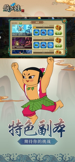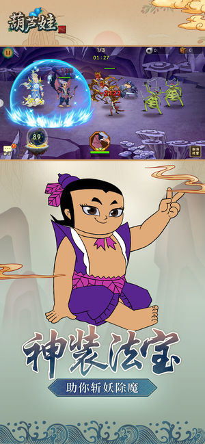 游戏简介: 还原葫芦娃动画经典,我们不毁童年! 阳光游戏,童年的经典,与王祖蓝相遇,齐心协力兄弟情深! 精品游戏,彰显怀旧魅力,与王祖蓝携手,畅享不一样的游戏体验! 最专业的手游,最专心的制作,与《葫芦娃》首席娱乐官王祖蓝一起拯救爷爷! 一起打蛇精,救爷爷,闯入《葫芦娃》的世界来吧! 由上海美术电影制片厂正版授权,以86年《葫芦兄弟》剪纸动画片为背景的手游大作。深度还原动漫情节,开创横版战斗手游全新玩法,挥别传统AI组队、电脑控制,策略搭配,默契组合,与游戏好友实时互动,共闯妖巢!当年的你,只能看着电视屏幕暗自捉急,如今,你却可以带着团结勇敢的葫芦娃们,拼荆斩棘,怒破妖洞大门!此番能否救出…