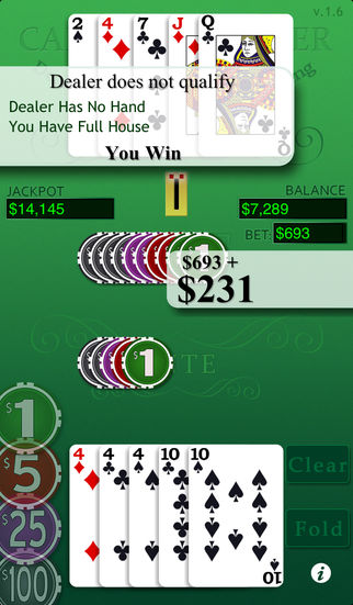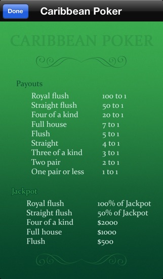 Play one of the most exciting table game in the casinos around the world. Caribbean Stud Poker is one of the most popular table games with rules similar to five card stud poker. Play against the house rather than against other players. Try to win the progressive jackpot! Caribbean Poker features great graphics, animations and sounds. FEATURES: - iOS 8 ready - Optimized for 3.5 & 4 screens - Nice graphics and animations. - Sounds were designed from the top - Jackpot increase on each hand - Easy to learn